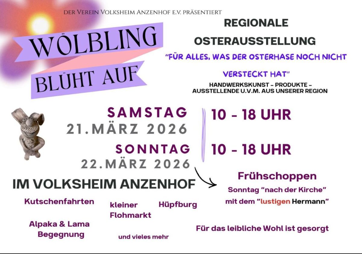 Vereine"FÜR ALLES, WAS DER OSTERHASE NOCH NICHT VERSTECKT HAT" HANDWERKSKUNST - PRODUKTE - AUSSTELLENDE U.V.M. AUS UNSERER REGION Kutschenfahrten kleiner Hüpfburg mit dem "lustigen Hermann" Flohmarkt Alpaka & Lama Begegnung Für das leibliche Wohl ist gesorgt und vieles mehr